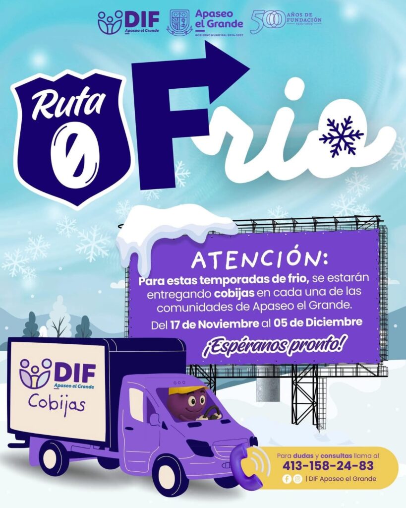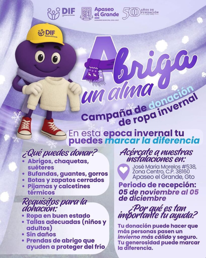 Apaseo el Grande, Gto.- Ante la llegada de la temporada invernal, el DIF Municipal anunció el inicio de dos importantes campañas sociales que buscan brindar apoyo, abrigo y cercanía a las familias que más lo necesitan: “Ruta 0 Frío” y “Abriga un Alma”, ambas impulsadas por El Nuevo DIF para fortalecer la empatía y la solidaridad en la comunidad apaseense.